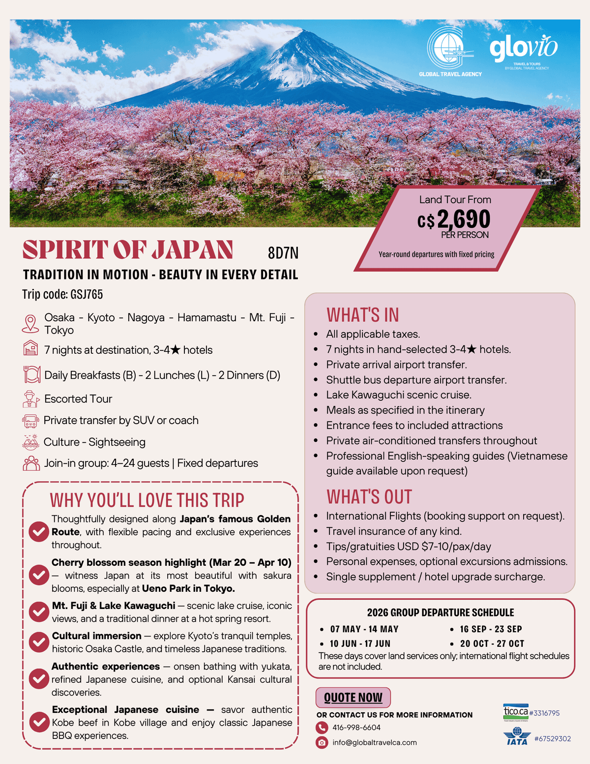 Discover Japan’s most iconic destinations along the famous Golden Route. This classic journey takes you from the vibrant city of Tokyo to the cultural heart of Kyoto, with unforgettable stops in Mt. Fuji, Hakone, and Osaka. Experience a perfect blend of modern innovation, traditional heritage, stunning landscapes, and authentic Japanese cuisine in one unforgettable trip.